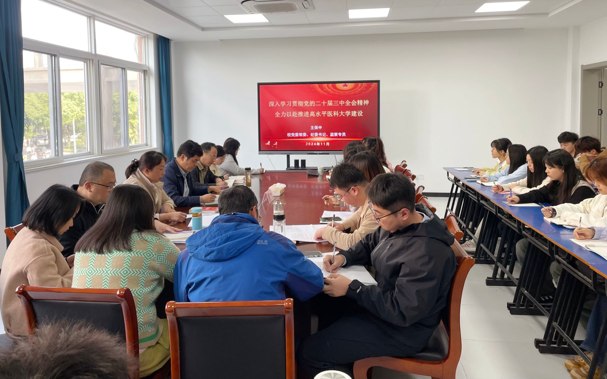 王保中强调,学校正处于高质量发展的关键阶段,全体师生、尤其是党员干部,要深入学习宣传贯彻党的二十届三中全会精神,进一步解放思想、全面深化综合改革,统筹推动学校改革发展。一要在完善立德树人体制机制上真改、真破、真立,推动深化教育教学改革;二要在提升治理体系和治理能力现代化上真改、真破、真立,推动治理模式改革;三要在教育科技人才协同融合发展上真改、真破、真立,推动“三位一体”改革;四要在完善人事人才体制机制上真改、真破、真立,推动人才队伍建设综合改革。“强教必先强师”,学院要锚定学校发展目标,抓住人才培养和服务学校发展两条主线,推动全会精神在学校高质量发展中落地生根。(张秦/文、摄)