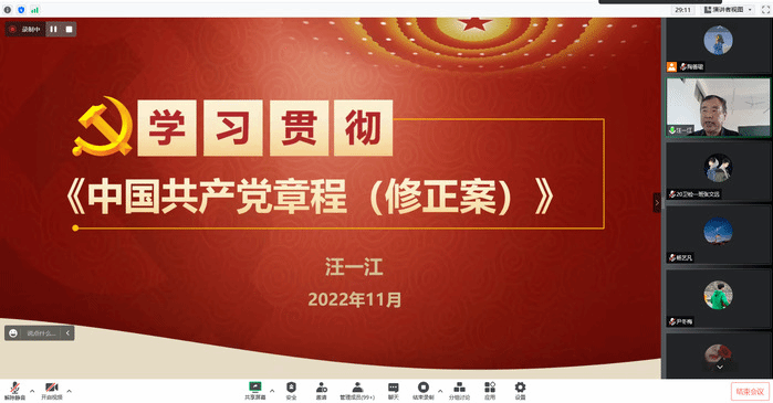 为深入学习贯彻党的二十大精神,加强学院师生对新党章的认识,11月10日,beat365正版唯一官方网站众禾学堂联合校关工委“五老”报告团成员汪一江教授,通过腾讯会议开展学习贯彻《中国共产党章程(修正案)》专题讲座,讲座由学院关工委秘书陶善珺主持,学院全体师生党员参加。