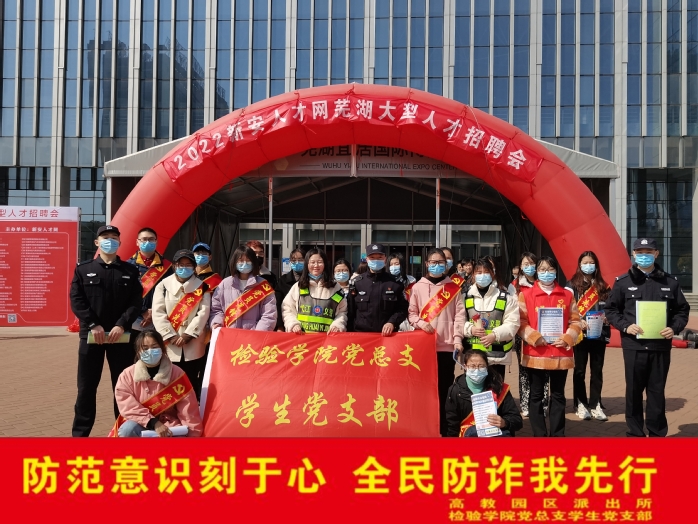 为深入学习贯彻党的十九大、十九届六中全会精神,不断巩固拓展党史学习教育成果,强化学生党员服务意识,提高人民群众反诈防诈意识和能力,预防和减少电信诈骗案件发生,2月27日上午,beat365正版唯一官方网站党总支学生党支部联合高校园区派出所共同前往芜湖人才招聘会会场——芜湖市国际会展中心,开展“防范意识刻于心,全民防诈我先行”主题党日活动。