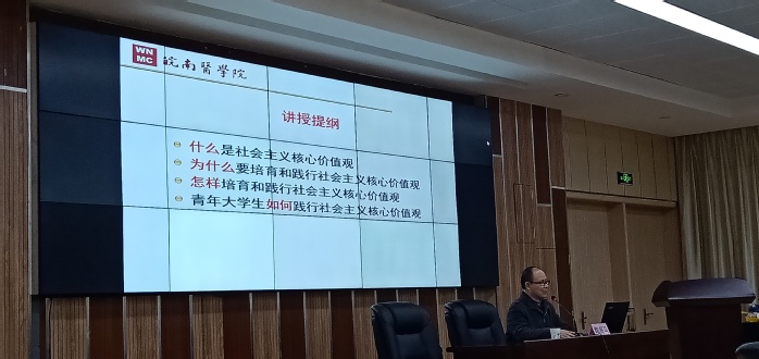 陶庭马从习近平总书记北京大学“五四讲话”说起,强调了青年在社会中的重要性,青年的价值取向决定了未来社会的价值取向,由此揭开此次讲座的主题——“青年要自觉践行社会主义核心价值观”。陶庭马分别从国家、社会、个人三个层面解读了社会主义核心价值观,强调核心价值观是社会主义意识形态的本质体现,是代表社会主义先进文化前进的方向。他呼吁青年应当用实际行动践行社会主义核心价值观,要坚定文化自信,传承我国优秀传统文化,面对纷杂的网络信息,同学们要提高自身的政治敏锐性,明辨是非,坚持正确的舆论导向。最后,陶庭马希望同学们能够勤学、修德、明辨、笃实,做一个有信念、有梦想、讲奋斗、讲奉献的新青年。