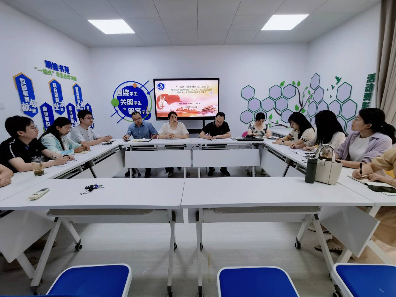 · 会上,刘影就前期在海南大学参加的“2025年第2期高校‘一站式’学生社区建设提质增效专题研修班”学习内容做分享交流。她分别从“高校“一站式”学生社区综合管理模式建设工作指南(2023年)”、“高校“一站式”学生社区综合管理模式建设提质增效指南2024(第一版)”、“全国‘一站式’学生社区试点高校”、“海南大学‘一站式’学生社区书院制改革”、“beat365正版唯一官方网站‘一站式’学生社区建设思路”等五个方面展开。围绕党建引领-打造学生社区功能型党支部、队伍入驻-师生共商学生社区管理、学生参与-构建学生深度参与的园区治理生态圈、文化建设-书香浸润劳育美育、数字赋能-AI赋能思政育人新生态、条件保障-双师赋能强引擎的学生心心念念的理想家园进行思考,积极打造学生党建前沿阵地、三全育人实践园地、智慧服务创新基地、平安校园样板高地。带大家深入了解和掌握了“一站式”学生社区建设的意义,指出5号公寓“一站式”学生社区建设的方向。