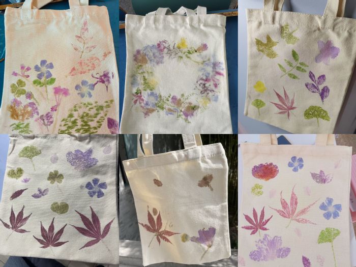 活动中,每组同学以白色帆布包、白色风筝为载体,利用采集好的新鲜植物进行帆布包的拓印,采用丙烯颜料进行风筝的彩绘,有以枫叶为主体,塑造出一幅红叶满山的风景;有以绣球花为主体,描绘出一幅春和景明的场景。在颜料的渲染下,风筝被赋予色彩斑斓的新活力。画面丰富,色彩鲜明,每一件作品充满了创意和灵感。