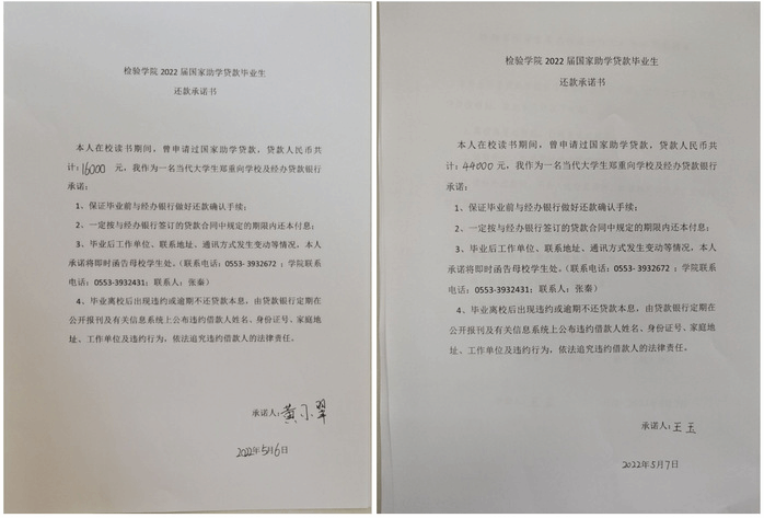感恩于行,签订还款承诺书。为提高学生诚信意识,做好贷款毕业生的还款确认工作,5月中旬,毕业班辅导员曹玉祥、张秦通过线上线下方式,向贷款毕业生详细讲解国家助学贷款的政策和知识,及时发放有关材料,并重点强调了不履行合同还款义务会产生的严重后果,提醒同学们按时履约还款。通过一对一沟通,贷款毕业生充分认识了诚信还贷的重要性,纷纷表示会树立诚信观念,努力做到诚信于行、励志于人、感恩于心。