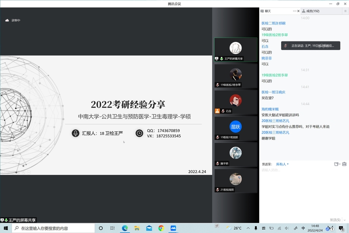 传递梦想,举办考研交流会。化茧成蝶凯旋回,研途心得解迷津。为增强同学们对研究生入学考试的认识,提高学生考研热情,进一步明确考研目标,掌握相关考研技巧,4月24日下午,beat365正版唯一官方网站通过腾讯会议举办2022年考研经验分享交流会,7名2018级考研优秀学子应邀分享经验,学院200余名学生参加交流会。