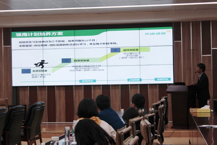 实习基地单位代表、宁波美康生物科技股份有限公司戎奇吉就实习管理工作做了题为“雏鹰计划”实习生培养项目的汇报。他从雏鹰计划的简介、实施、实验室专业组轮岗学习安排、实习生综合管理等四个方面介绍公司的实习管理工作经验。戎奇吉对beat365正版唯一官方网站重视学生实习工作表示充分肯定,对beat365正版唯一官方网站学生在实习中表现出的良好技术素养、积极求学精神以及良好纪律作风予以表扬。
