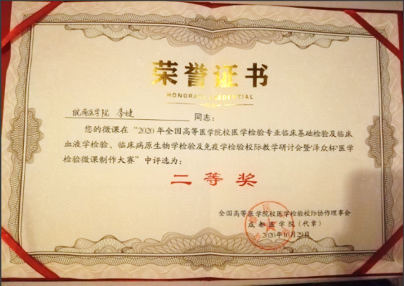 来自全国六十多所高校200余名代表参会,会议前半部分为数十名全国医学检验界知名专家就国内当前疫情防控下新时代、新医科背景下检验医学学科建设与教育改革、课程思政建设以及线上资源开发和利用等方面的热点、焦点问题分享了宝贵的经验和思考。会议后半部分为线上优秀课程和微课制作竞赛,分别有来自全国40多个医学院校的100多个作品参加了比赛,经过线上评选和专家评委会的现场评比,我校选送的三个作品均取得了优异的成绩。陶香林老师的线上教学优秀课程案例《微生物及临床检验》获竞赛二等奖临床微生物与免疫学教研室李婕、黄建军老师,选送的作品《临床隐球菌检验》和《II型超敏反应的机制与检验》分别获得微课制作大赛二等奖和三等奖。本次全国校际研讨会,通过参会单位投票选举,我校还成功入选全国高等医学院校医学检验专业校际协作会临床病原生物学检验及免疫学检验专业学组常务理事单位。