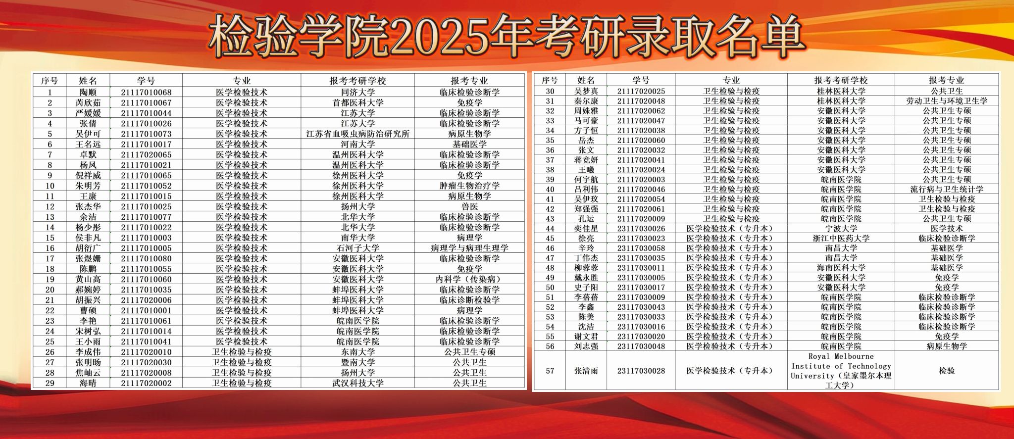 随着4月30日考研调剂系统的关闭,2025年研究生复试工作全面结束。beat365正版唯一官方网站2025届186名毕业生中,共考研拟录取57人,包括境内升学56人、境外留学1人,升学率达30.65%,再创升学率新纪录。其中,2021级医学检验技术专业升学率为31.65%、2021级卫生检验与检疫专业升学率为38.30%、2023级医学检验技术(专升本)专业升学率为23.33%,均为历史升学率最高纪录。