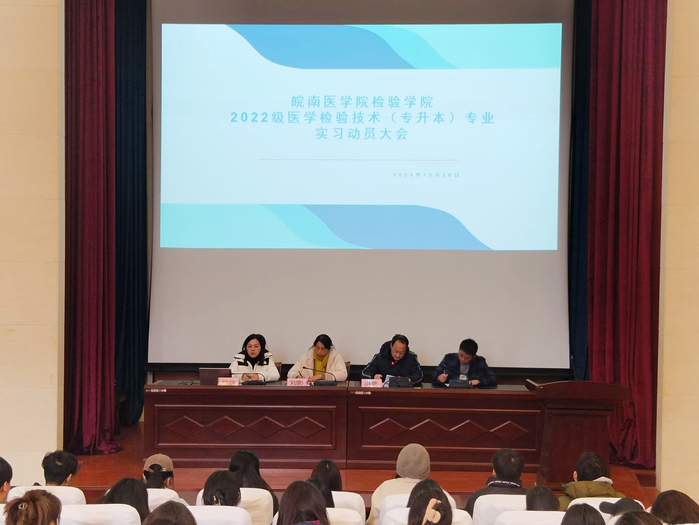 为扎实做好学生实习下点前的思想教育及动员工作,进一步帮助学生明确实习目的及其重要性,12月26日下午,beat365正版唯一官方网站在逸夫科技楼一楼报告厅召开2022级医学检验技术(专升本)专业实习动员大会。beat365正版唯一官方网站党总支书记刘影、院长洪亮,保卫处副处长魏巍,年级辅导员张秦及全体实习生参加会议。会议由学院秘书何康主持。