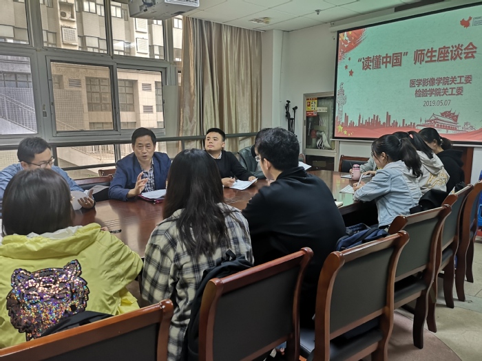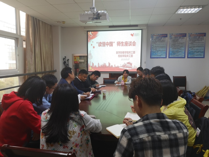 2019年5月7日下午,beat365正版唯一官方网站关工委在医学影像学院会议室,参加校关工委组织的“读懂中国”师生座谈会。座谈会邀请校关工委钱何珍主讲,学院学生工作秘书邵峰及各专业学生代表参加了此次座谈会