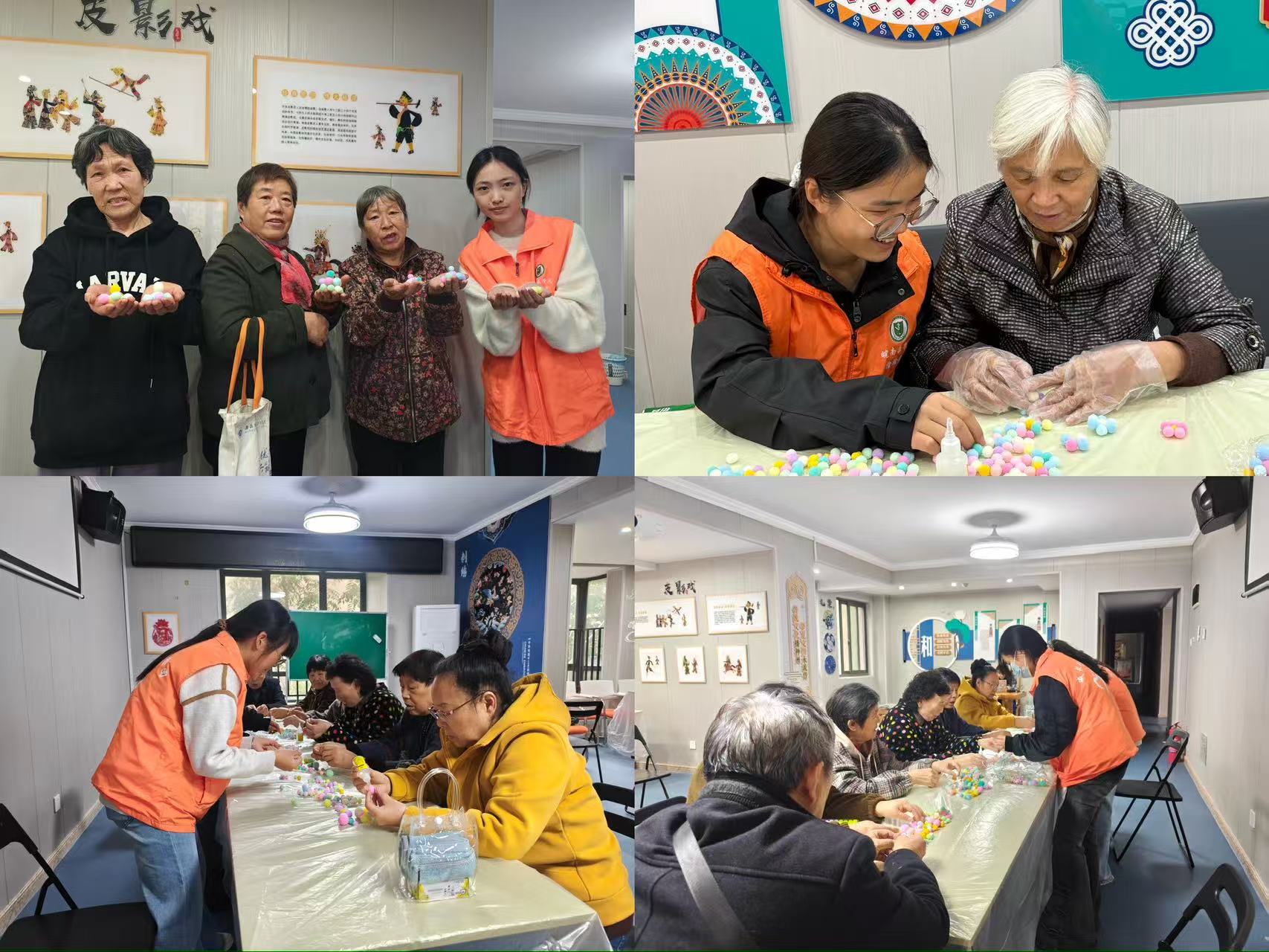 巧手制作杯垫,乐趣浸润时光。本次活动还特别设置了“花朵杯垫DIY”环节。在志愿者们的耐心协助下,老人们动手将五彩的绒球拼贴成精美的杯垫。巧手翻飞间,传递的不仅是手工的乐趣,更是跨越年龄的温情与陪伴,活动现场充满了欢声笑语。