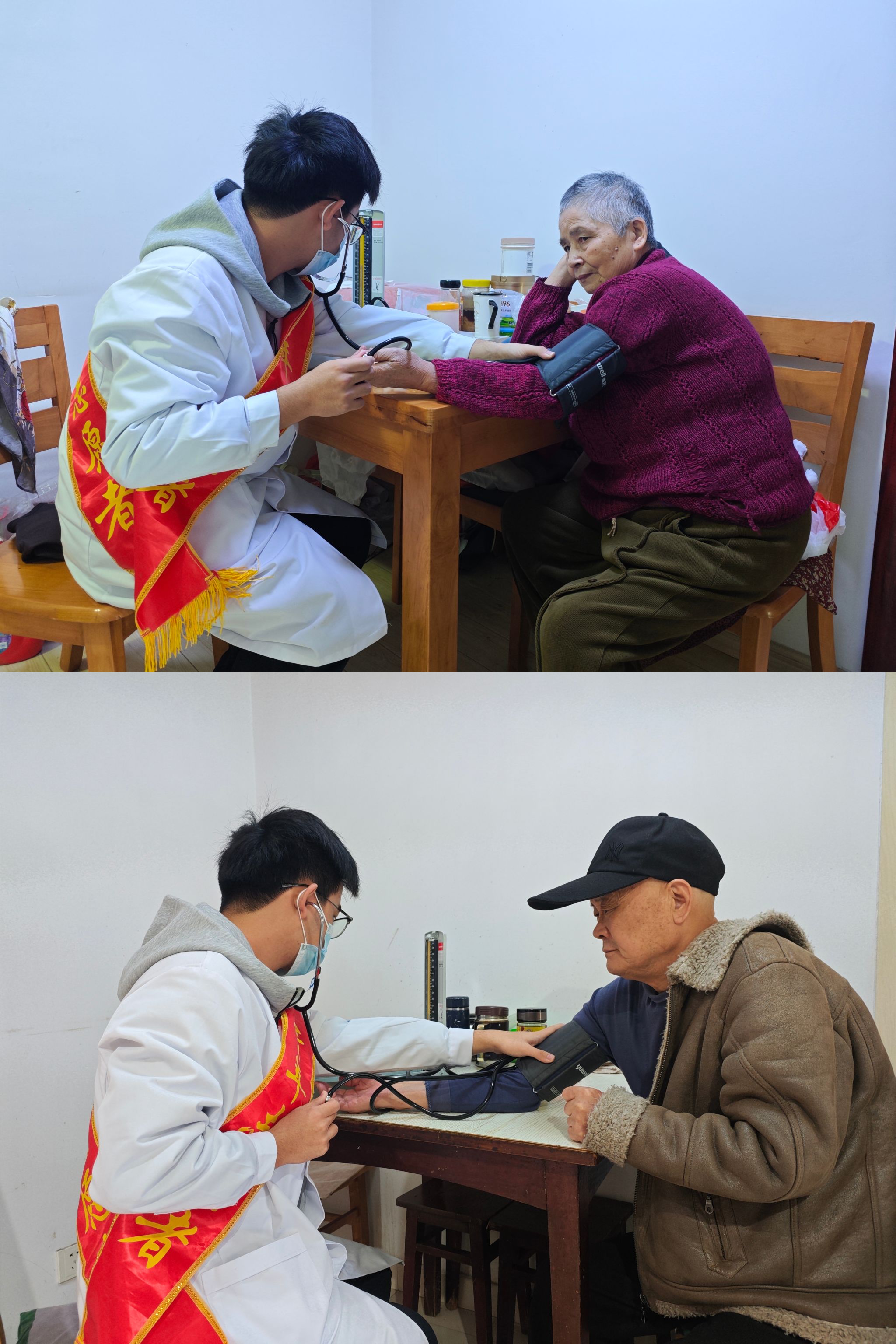 入户探访老人,关怀直抵心扉。在社区工作人员的引领下,志愿团还组建了小分队,入户探望行动不便的老人。志愿者们陪老人拉家常,提供血压检测服务,并送上精心准备的慰问品,将最直接的温暖与关怀送到了老人身边和心坎上。