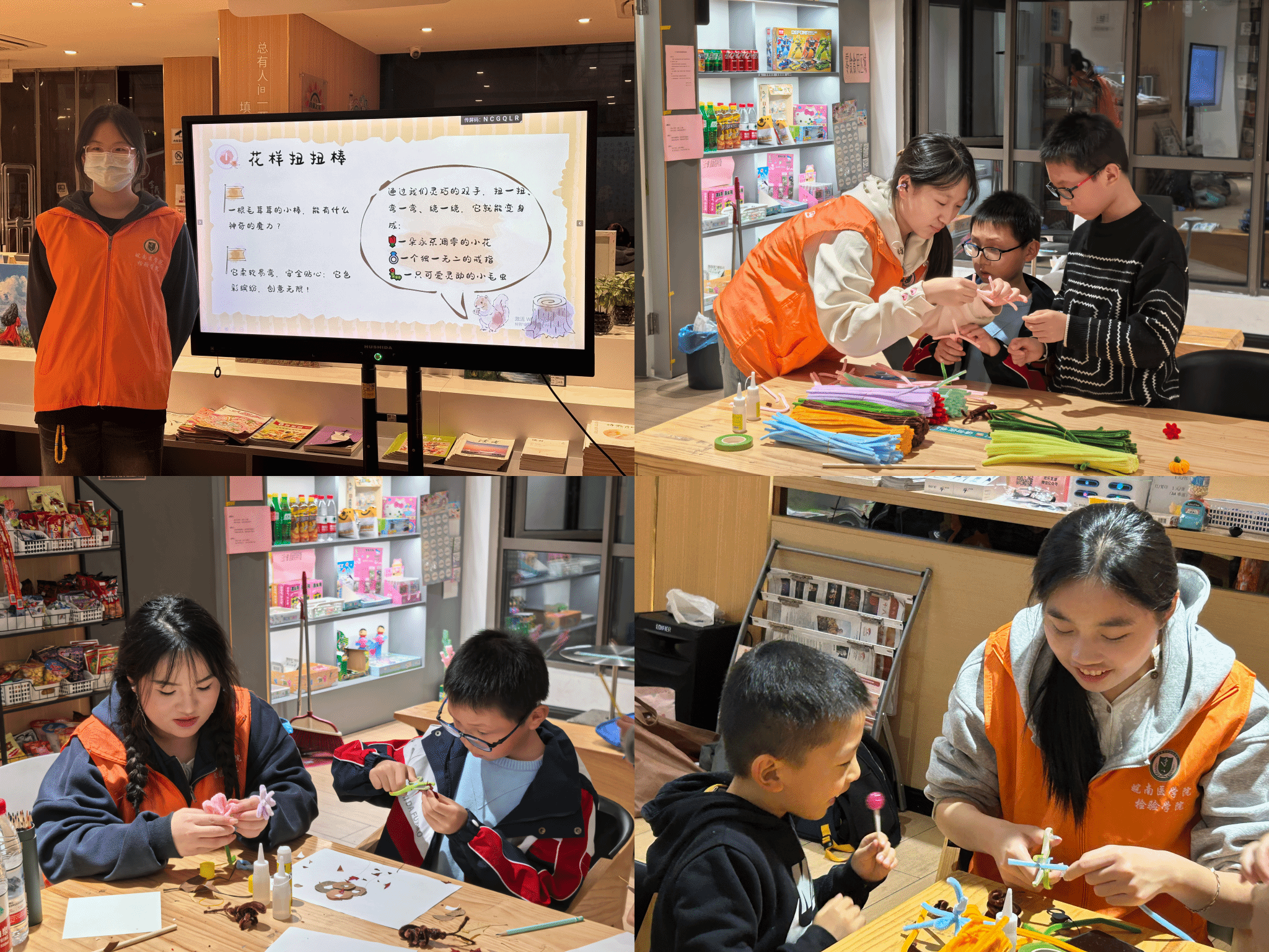 巧思妙手,扭扭生趣。在手工创作环节,志愿者们带领小朋友们开展扭扭棒制作活动。志愿者们先向小朋友们展示了扭扭棒花朵、小动物等精美作品,随后手把手教他们弯折、缠绕扭扭棒。小朋友们充分发挥想象力,有的制作出色彩斑斓的蝴蝶,有的拼接出可爱的长颈鹿,现场充满了欢声笑语。一根根普通的扭扭棒,在小朋友们的巧手下变成了一个个充满童趣的艺术品,每一件作品都凝聚着他们的创意与快乐。