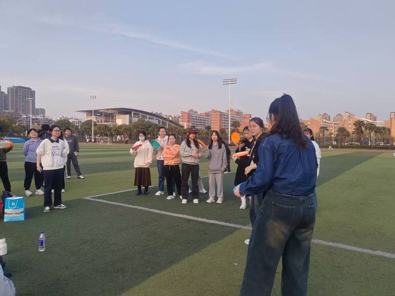 在活动开始前,所有同学分成两队,经验丰富的学长耐心向同学们传授抛出和接好飞盘、让飞盘飞得更加平稳、更加远的方法等飞盘技巧。同学们在学习过程中传递着飞盘运动互相尊重拼搏到底的本质,感悟着“盘不落地不放弃”的飞盘精神。