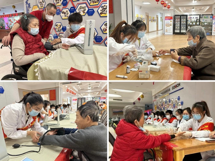 爱心检测零距离。奉献之心励志于行,检测之意服务于人。志愿者们在大厅内搭建检测工作台,为老人们测量血糖、血压。面对老人提出的关于健康的问题,志愿者们从专业知识的角度进行解答,同时根据老年人的健康状况和生活习惯等给出合理建议。志愿者们不仅锻炼了自己,同时也为能够帮助他人感到愉悦幸福。