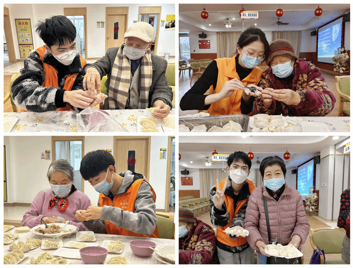 真情饺子送温暖。为迎接即将到来的冬至,志愿者们在颐养院组织了一场别开生面的“饺子宴”,与爷爷奶奶们共同参与到包饺子的活动中来。同学们与老人们分工合作,你擀皮,我包馅,亲手制作了各式各样的饺子。过程中,老年人们感受到了团圆与温暖,志愿者们则深刻地体会到传统习俗中蕴含的美好祝愿。