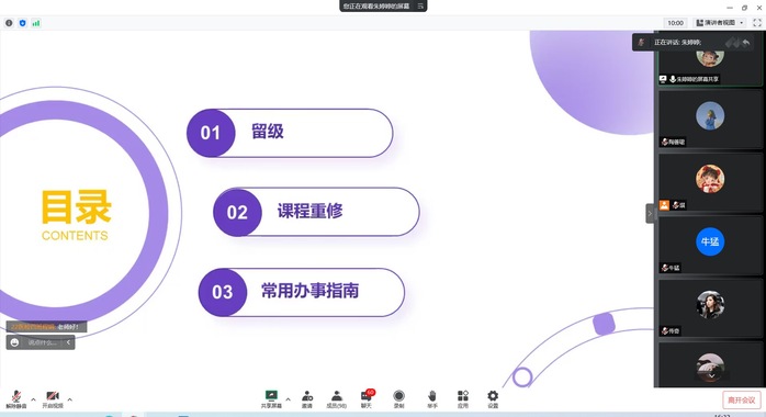 会上,教务处朱婷婷老师针对学生关心的学籍、成绩等管理规定,为大家详细解读了留级、课程重修等相关政策,并向新生介绍了教务系统中有关缓免考申请、成绩复查、空教室查询、一体化证明、学生证补办等一些常用的办事指南,让新生对教务系统的使用有了更加全面地了解,对学籍、成绩管理有了更加深刻地认识。最后,教务处党员老师还与新生进行互动交流,对同学们关心的期末考试等问题一一进行解答。