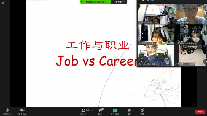刘沁从“天、生、我、才”四个方面对如何正确规划未来职业进行分析,借助“工作、“职业”、“人脉”、“他人影响”四个角度对职业规划的理解、看法、态度、做法进行讲解,同时通过观看小视频、组内讨论交流“对自己工作影响人物”等线上互动来帮助同学们对职业规划更深入的了解。最后,刘沁鼓励同学们从当下开始做好自己,认真思考未来,不负韶华,最终成就更优秀的自己。