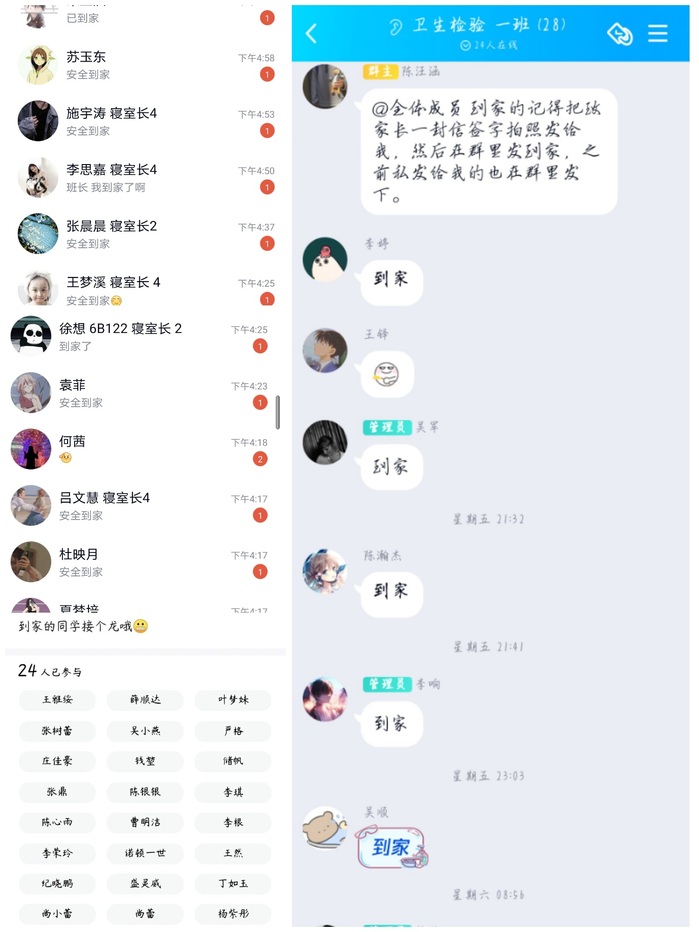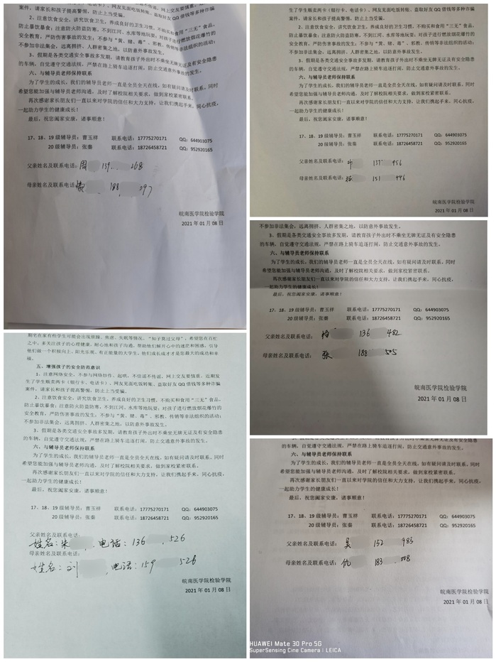 2021年1月12日,辅导员张秦在3301教室召开年级大会,20级全体同学参加。大会上,张秦从疫情防控、人身财产、交通安全、宿舍安全、宗教意识形态五个方面,列举了安全事故的危险性,并根据存在的安全问题提出了解决方案和防范措施。会后,组织所有学生填写假期行程登记表。1月16日正式放假,安全到家的同学将已签署的《致家长的一封信》拍照上传至班群,并打卡报平安。