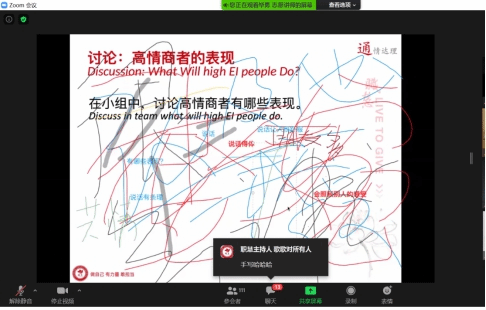 毕勇从“通、情、达、理”四个方面对如何提高情商进行分析,借助“什么是情商”、“识别表情”、“转化情绪”、“情感账户”四个角度对情商的认知、表现、转化、存取进行解读,同时通过观看无声电影、组内讨论分享转化情绪的方法等线上互动来帮助同学们识别情绪变化。最后,毕勇鼓励同学们从现在开始学会改变自己,按照科学方法逐步提高情绪识别能力以及情绪控制能力,最终达到提高人际交往能力的目的。