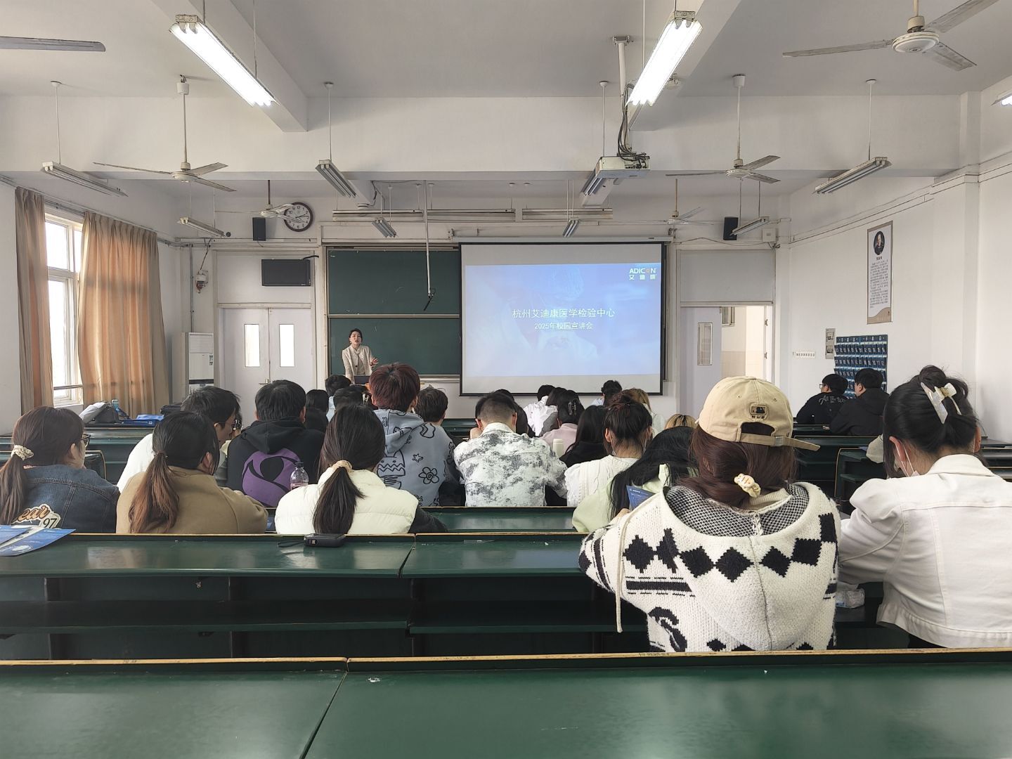 合肥艾迪康医学检验中心人事部经理郭孟捷和杭州艾迪康医学检验中心人事部经理程珍对2025届毕业班50余名毕业生进行了招聘宣讲。向所有同学详细介绍了公司的发展历程、核心业务、人才培养体系、实习与就业薪资待遇,并进行了现场交流。线上线下共投递简历20余份,其中7位同学有强烈就业意愿。
