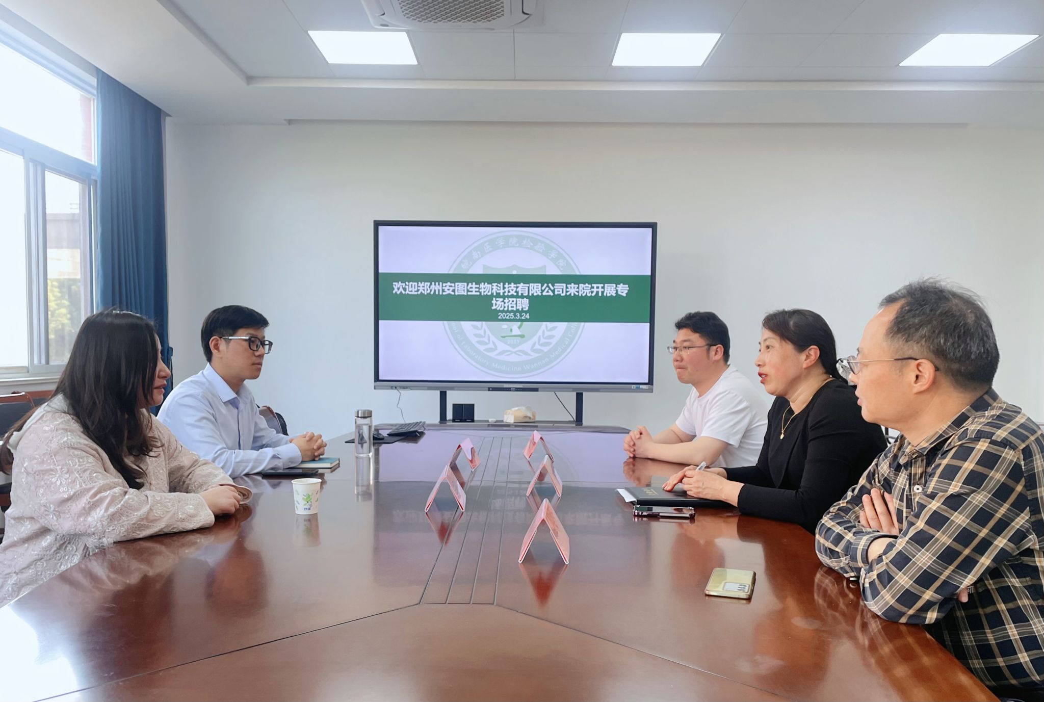 会前,beat365正版唯一官方网站党委书记刘影、院长洪亮和辅导员曹玉祥对郑州安图生物工程有限公司安徽分公司市场部经理熊子超、刘致晟来校选留毕业生表示热烈欢迎,对公司在beat365正版唯一官方网站设立安图奖学金、助学金表示衷心感谢,双方就进一步开展校企合作展开深入交流。