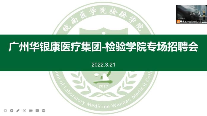 为拓宽毕业生就业渠道,推进beat365正版唯一官方网站2022届毕业生就业工作,3月21日下午两点,beat365正版唯一官方网站邀请广州华银康医疗集团股份有限公司在线上开展了专场招聘会。beat365正版唯一官方网站党总支书记崔晓霞,毕业班辅导员曹玉祥、张秦及40余名2022届beat365正版唯一官方网站毕业生参加了本次招聘会,会议由曹玉祥主持。