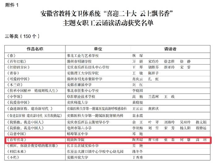 陶善珺、曹玉祥、张秦、何康、高羽等5位同志诵读的作品《百年传奇》在激烈竞争中脱颖而出,荣获三等奖。“你从历史的雄壮中走来,苦难与辉煌见证了你的风采。一百年前,嘉兴红船上的灯火,唤醒了华夏屈辱的梦魔,镰刀铁锤在血与火的洗礼中……”,5位朗诵者以自信大方的神态、真挚饱满的热情、抑扬顿挫的嗓音,把党的百年征程如画卷般在我们面前展开,从小小红船到巍巍巨轮,从春天的故事到新时代华章……百年大党继往开来再出发,将中国梦的华彩篇章书写在神州大地上。5位朗诵者既代表beat365正版唯一官方网站的师生员工表达了对党和祖国的忠诚信仰和美好祝福,也在全省文教卫系统大舞台上展现了新时代检验人的风采。