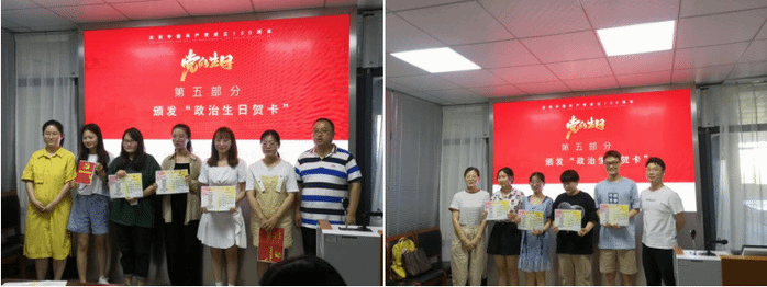 教工党支部书记孙恩涛、学生党支部书记陶善珺和学生党支部委员曹玉祥、张秦为十六名学生党员颁发“政治生日”贺卡,——献上热情洋溢、语重心长的特别祝福。之后,全体党员同志观看2017级,2018级学生党员拍摄的祝福视频并许下政治生日愿望,分发政治生日蛋糕。