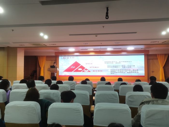 伴随着主持人的开场白,活动正式开始,参加评选的班级代表及个人根据抽签顺序依次上台。在“优良学风班”的评选过程中,班级代表借助精美的PPT,结合班级特点,围绕班级建设、学风建设、班级荣誉、特色工作四个方面,将各班的亮点和特色展示的精彩纷呈。在“优秀学子”的评选过程中,五位“优秀学子”候选人从专业学习、文艺活动、科技创新、社会实践等方面进行自我展示,向大家展现自己积极乐观、奋发向上的风采,赢得现场观众的阵阵掌声。