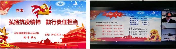 浦春以“弘扬抗疫精神、践行责任担当”为主题,从四个方面开展党课。以民族精神为切入点,强调面对疫情难关,全国上下凝心聚力,共同抗击,众志成城战疫情的决心和勇气。接着,以我校第一附属医院重症医学科副主任姜小敢同志的个人优秀事迹,深刻剖析中华民族的伟大精神。这是一种“万民一心、同舟共济的精神”,是一种“崇尚科学、勇于创新的精神”,更是一种“不怕牺牲、敢于胜利的精神”,告诫同学们加入中国共产党代表的是一份担当与责任,作为一名共产党员,要时刻将人民群众的利益放在第一位,不忘初心,方能始终。