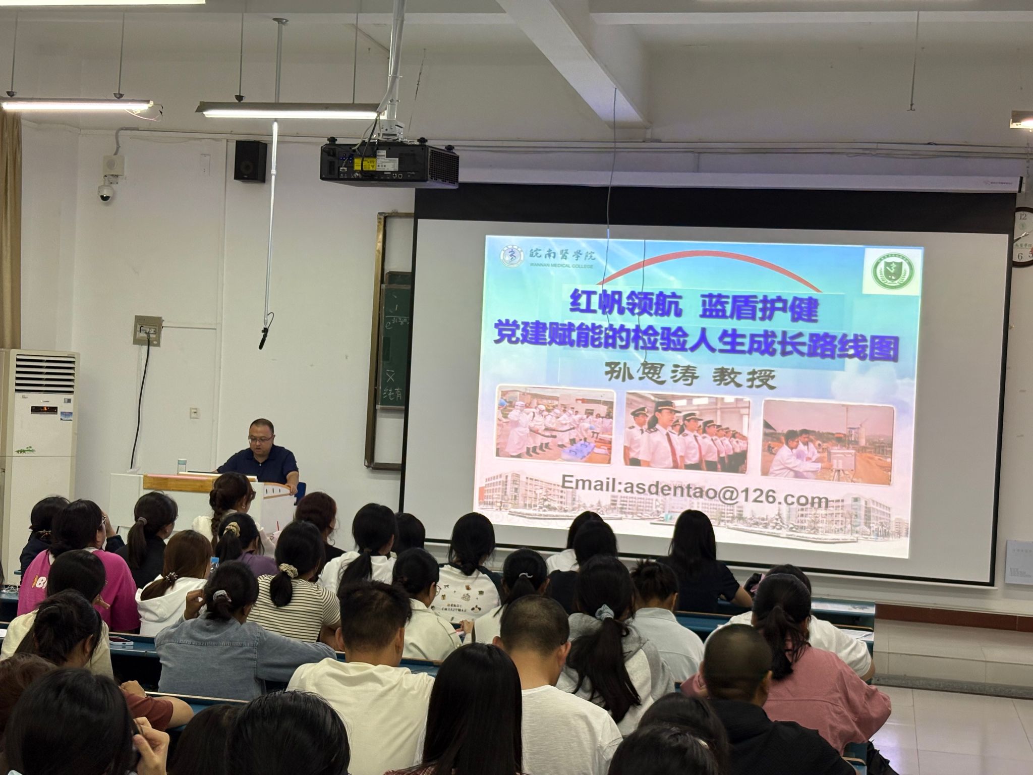 9月24日晚七点,beat365正版唯一官方网站在滨江校区(南区)西二教学楼2501教室开展第五期“检优论坛”:红帆领航 蓝盾护健 党建赋能的检验人生成长路线图,旨在高质量党建引领高质量发展,帮助学生稳定专业思想,确立专业目标,明确发展方向,讲座由校第二批“双带头人”工作室负责人、卫检教师党支部书记孙恩涛教授主讲,2025级辅导员及全体新生参加。